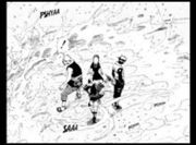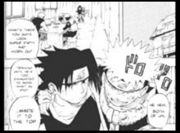 Sasukes Hand zittert und plötzlich hören sie Zabuzas Stimme. Er meint spöttisch, dass die Göre ja schon wieder ängstlich zittert. Auch schon sind sie von vielen Wasserclonen umzingelt. Doch Sasuke sagt, dass er vor Aufregung zittert und erledigt die Clone in kürzester Zeit. Der echte Zabuza und Haku zeigen sich nun und er ist leicht beeindruckt, über Sasukes Wachstum und meint zu Haku, dass er wohl einen neuen Rivalen hat…
