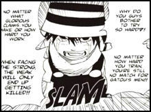 Er schreit die Ninja an. Warum sie sich so ins Zeug legen?! Es ist sinnlos, gegen Gatou zu kämpfen, sie werden eh getötet! Alle kucken erschrocken, ausser Naruto, er kontert. Er fragt ihn, ob es okay für ihn ist, den Star der Tragödie zu spielen und den ganzen tag zu heulen?! Dann schreit er ihn noch an: „Du kleiner Idiot hör endlich auf, den ganzen Tag nur zu heulen! Du Waschlappen!“