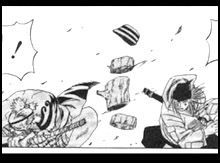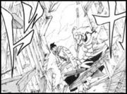 Dieser erzeugt einen Wirbelsturm und ist sofort neben Sasuke und greift ihn mit einer langen Nadel (Senbon) an. Doch Sasuke kann ausweichen und sich mit seinem Kunai verteidigen.