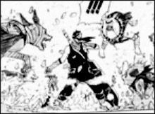 Kakashi vollendet nun seine Beschwörung. Zabuza verspottet Kakashi noch immer, da er weiss, das Kakashi in seinem Nebel Jutsu kein Orientierung hat, als plötzlich der Boden unter ihm bebt und Hunde aus der Erde springen, welche Zabuza an allen Körperregionen festhalten. Kakashi meint, dass bei dem Nebel zwar die Augen versagen, aber nicht die Nase eines Hundes! Kakashi erklärt seine Taktik: Als er mit Zabuza im Nahkampf verwickelt war, ist durch Zabuzas Schwertangriff Kakashis Blut an sein Schwert gekommen, welches die Hunde aufspüren konnten! Kakashi meint lässig: „Der Nebel klart auf und die Zukunft ist dein Tod!“.