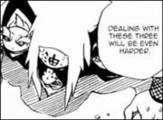 Mit den Gesang locken sie ihre Gegner sofort an. Da sie von der Illusion noch nicht komplett gefangen sind, greifen sie Jiraiya an, doch es war nur ein Doppelgänger. Der echte Jiraiya greift nun aus den Hinterhalt an und stellt fest, dass jeder nur eine Technik beherrscht! Nagato beherrscht die Kuchiyose und der Dicke kann Chakra absorbieren. Der dünnere hat bis jetzt nur etwas Taijutsu verwendet...