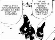 Das Fazit ist, das sie nicht weiter wie bisher mehr angreifen können, da sie keinerlei Überraschungsmomente mehr haben und immer in drei Blickwinkeln zu sehen sind. Aber es gibt noch andere Mittel statt Ninjutsu und Taijutsu. Sie wollen es mit Genjutsu versuchen! Jiraiya übernimmt dann den Angriff aus dem Hinterhalt, da er kaum Genjutsu beherrscht, jedoch die Frösche!