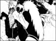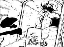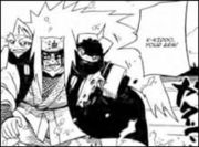 Im Gehen fragt er die Frösche, wie es ihnen geht. Sie sagen ihm, dass ihre Kehlen nun angeschwollen sind und diese Technik vorerst nicht mehr benutzt werden kann. Jiraiya bittet um Entschuldigung und ehe sie antworten taucht ein Angreifer aus dem Nichts aus und donnert Jiraiya gegen ein Gebäude. Und fällt anschliessend ins Wasser. Als Jiraiya sich aufrichtet, stellen die Frösche mit Erschrecken fest, dass er seinen linken Arm verloren hat. Jedoch bekümmert es Jiraiya in diesem Moment nicht, da der neue Angreifer wieder ein Pain ist und einen gefährlichen Eindruck macht!