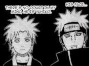 Da dieses Jiraiya jedoch noch weiter geschwächt hat, lehnt er sich erneut gegen die Säule und hält sich, so weit es ihm mit einem Arm möglich ist, seine Wunden. Er stellt fest, dass es gar nicht verwunderlich ist, wenn sie nun auch noch verrückte Waffen haben, schliesslich sind sie selbst auch alles andere als normal. Zudem meint er, dass sie auf keinen Fall Menschen sind. Sie sind etwas Anderes, er ist sich nur noch nicht sicher, was genau. Während er darüber nachdenkt, fällt ihm wieder ein, was einer der Ame-Nin gesagt hat, als er diesen verhörte. Er meinte, dass manche behaupten, Pain würde nicht einmal existieren. Ausserdem ist sich Jiraiya sehr sicher, dass der eine Pain, der Yahiko ähnlich sieht, auch wirklich Yahiko ist! Doch wie kann das nur sein, immerhin hatte Yahiko nie ein Rinnegan? Zudem hat Jiraiya das Gefühl, dass er auch die anderen Pains kennt, doch weiss er nicht genau, woher. Jiraiya erinnert sich auch noch an sein Gespräch mit Nagato, als dieser noch ein Kind war, und fragt sich, warum sein Schüler so einen falschen Weg eingeschlagen hat.
