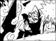Jiraiya ist erschöpft und sitzt mit einem Stab, der sich durch seine Schulter gebohrt hat, an einer Säule. Die beiden Frösche schauen besorgt zu ihrem Verbündetem hinab, welcher schwer atmet. Der Pain, der sich ihm zu Anfang auch als Pain vorgestellt hatte, hat Jiraiyas Barriere durchdrungen und den Sannin mit der Lanze angegriffen, obwohl er sich selbst nicht einmal mehr auf den Beinen halten kann. Es scheint ein harter Kampf geschehen zu sein, weil er einige Wunden aufweist und sein Stirnband schon so verrutscht ist, dass es eins seiner Rinnegan überdeckt. Jiraiya kann es kaum glauben, dass Pain direkt durch seine Barriere durch ist und sich so selbst verwundet hat, doch dann bemerkt er, als er es gerade zu Ende bringen will, dass sein Chakra vollkommen verrückt spielt und er es nicht kontrollieren kann. Der männliche Frosch überlegt kurz, bevor er aber meint, dass es an der Lanze liege und diese schnell aus Jiraiyas Körper zieht.