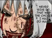 Die fünf verbliebenen Pains haben Jiraiya aus dem Hinterhalt angegriffen, während dieser dabei war, die wahre Identität von Pain herauszufinden. Jeder von ihnen hat Jiraiya eine Lanze in den Rücken gerammt, weshalb der Sannin nun kurz vor seinem Tod steht. Er will die Informationen, die er noch sammeln konnte, dem Froscheremiten mitteilen, doch schafft er es nicht mehr, noch genug Kraft dafür aufzubringen. Er fühlt, dass seine Kehle komplett mit seinem Blut gefüllt ist und er deswegen nicht mehr sprechen kann. Der männliche Frosch schreit ihm noch etwas zu, doch Jiraiya ist schon so schwach, dass er es nicht mehr versteht. Mit seiner letzten Kraft versucht er noch, sich aufzurichten, doch es ist vergebens. Während das Leben aus seinen Augen verschwindet, fragt er sich, ob es nun sein Ende ist und ob er alle enttäuscht hat.