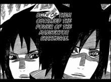 Dabei aktivierten sie mit der Zeit auch das Sharingan und ihre Namen verbreiteten sich im ganzen Clan, weil sie schon in so jungen Jahren das Kekkei Genkai erweckt hatten. Die beiden Brüder, welche fast genau so aussahen wie Sasuke und Itachi, kämpften immer weiter, in der Hoffnung, sich noch mehr zu verbessern. So kam es auch, dass sie das Mangekyou Sharingan erweckten. Es war das erste Mal in der Geschichte des Clans, dass jemand die Macht des Mangekyou Sharingan erhielt, also war es nicht verwunderlich, dass die beiden Brüder die Anführer des Clans wurden. Während der jüngere Bruder eine ähnliche Version des Mangekyou Sharingan hatte, wie Itachi, hatte Madara ein weitaus mächtigeres Mangekyou. So kam es auch, dass er der wahre Anführer wurde. Doch mit der Zeit geschah etwas Merkwürdiges, denn der sonst so gesunde Madara bemerkte, dass sich seine Sicht immer mehr verschlechterte. Itachi geht noch einmal darauf ein, was Sasuke gesagt hat, nämlich, dass man immer mehr zum Status der absoluten Blindheit gerät, je mehr man das Mangekyou Sharingan einsetzt. Er meint, dass dies das Schicksal des Mangekyou Sharingan ist. Man erhält eine unvorstellbare Kraft, die man allerdings mit der Zeit durch den Verlust sämtlicher Macht wieder einbüssen muss.