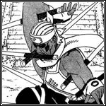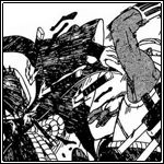 Dieser wirft die Schwerter in die Luft, was Karin sehr erstaunt, und fängt sie auf, allerdings nicht mit den Hände, er klemmt die Schwerter zwischen dem Nacken, der Kniekehle dem Ellbogen, dem Bauch, den Achseln und den Zähnen ein. Suigetsu versteht nicht was er in dieser Pose ausrichten will, aber der Jinchuuriki greift damit an. Wie eine Stachelkugel stürzt er sich auf Sasuke und schlägt auf ihn ein. Sasuke kann gerade noch abwehren, doch nun schleudert der Jinchuuriki zwei Schwerter in die Luft und zur Sicherheit anktiviert Sasuke sein Sharingan. Doch der Jinchuuriki sticht auf ihn ein und trifft ihn. Karin erschrickt und Suigetsu ist Fassungslos, er konnte nicht einmal die Techink genau beobachten. Saskue steht auf und leitet sein Chidori in sein Schwert.