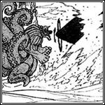 Als Sasuke daraufhin Juugo fragt, warum dieser ihn gerettet hat, antwortet der, dass er ihn nicht sterben lassen kann, da Sasuke das einzige ist, das ihm noch als Erinnerung an Kimimaro geblieben ist. Doch in diesem Moment greift das Bijuu sie an; die Drei können dem Angriff nicht mehr ausweichen. Allerdings springt Suigetsu noch vorne, während die Hälfte seines Körpers eine Wasserwelle bildet, die das Bijuu aufhält, um die anderen zu schützen. Das Bijuu stellt fest, dass Suigetsu, als ein Ninja, der das Wasser nutzt, ihm gegenüber im Vorteil ist. Suigetsu vermittelt seinen Teamkameraden, dass er diese Angelegenheit regeln wird, während sich die anderen in Sicherheit begeben sollen. Karin, Sasuke und Juugo rennen los und Suigetsu baut mit seinem Körper eine grosse Wand aus Wasser vor dem Bijuu auf.