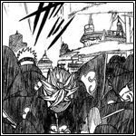Eine der Wachen, die losgeschickt wurden, stellt fest, dass die Angriffe scheinbar aus allen Richtungen scheinen zu kommen und wundert sich, da nur von einem Eindringling die Rede war. Sein Partner meint, dass er sie mit seinem Byakugan aufspüren wird, doch erwidert der andere darauf, dass sie alleine niemals genug Kraft aufwenden können, um alle Angreifer zu besiegen, weshalb er lieber der Hokage Bericht erstatten soll, nachdem er Verstärkung angefordert hat. Die Inkarnation der Hölle ist gerade dabei, einen Ninja durch eine besondere Technik nach dem Aufenthaltsort des Jinchuuriki zu „fragen“, doch stellt er fest, dass dieser dazu keine Informationen hat und tut darauf etwas, dass aussieht, als würde er ihm die Seele entziehen.