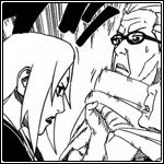 Inzwischen, wieder im Büro von Tsunade, erklärt Shizune die Bedeutung der Chakra-Receiver und meint, dass laut Fukasaku alle Inkarnationen von Pain solche Piercings hatten. Sie meint, dass diese Receiver vielleicht dafür sorgen kann, dass alle Pains gelenkt werden können, weiss es aber nicht genau und will mit dem Team von Ibiki sprechen. Beide sind sich jedoch sicher, dass diese Receiver etwas mit Pains Stärke zu tun haben. Tsunade befiehlt nun Shizune, sich mit Ibiki zu treffen, bevor sie selbst den Raum verlässt, um sich um die Verletzten zu kümmern, während sie einem Anbu befiehlt, dass dieser mit seinen Leuten Shizune und das Team von Ibiki beschützen soll. Sie meint, dass der Frosch das auch Fukasaku berichten soll, wenn er Naruto zurückholt, woraufhin dieser zurückgelassen wird. Er denkt, dass es nun an der Zeit sei, sich auf den Weg zu machen, doch gerade als er die Technik anwenden will, spritzt Blut und die Taucherbrille fliegt zu Boden. Hinter dem Frosch steht Danzou mit einem Schwert, während er mit einem dämonischen Blick sagt, dass der Kyuubi nun aus dem Spiel sei...