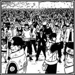 In der Zwischenzeit haben die drei Ninja aus Kumo, die der Raikage losgeschickt hat, die Wälder von Konoha erreicht. Omoi wundert sich, was er tun soll, wenn ihm alle Mädchen in Konoha auf einmal sagen würden, dass sie sich in ihn verliebt haben. Karui ist wieder einmal von ihm genervt und meint, dass er einfach mit der ausgehen soll, die ihn zuerst gefragt hat, doch antwortet Omoi darauf, dass es sein könnte, dass sie sich so unsterblich in ihn verliebt haben, dass sie ohne ihn nicht leben könnten und ihn dann dazu bringen würden, gemeinsam Selbstmord zu begehen. Karui kann nicht glauben, dass er schon wieder so weit voraus gedacht hat, woraufhin sie meint, dass sie aber auch nichts dagegen hätte, von einem gutaussehenden, reichen Mann in Konoha angesprochen zu werden. Als Omoi ihr sagt, dass ihr so etwas nie passieren wird, wirft sie einem Stein nach ihm, worauf Omoi meint, dass dieser Stein eine Lawine auslösen könnte, die Konoha zerstören könnte. Als die drei daraufhin im zerstörten Konoha ankommen, denkt Karui wirklich, dass sie daran Schuld ist, doch Samui bleibt gelassen und sucht jemanden, der ihnen sagen kann, was passiert ist.