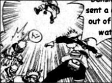 Obwohl Kakashi nebenbei sein Buch liesst und sich Naruto trotzdem sehr bemüht, hat er keine Chance. Kakashi weicht ihm Problemlos aus oder blockt seine Angriffe mühelos. Plötzlich sitzt Kakashi hinter Naruto und wendet Sennen Goroshi an, ein schmerzhafte Technik, worauf Naruto in den See fliegt. Während er unter Wasser ist, wirft er zwei Shuriken, doch Kakashi fängt sie wiederrum Mühelos. Doch Naruto gibt sich nicht geschlagen. Er denkt an den Kampf gegen Mizuki zurück, um Genin zu werden und will das nicht aufs Spiel setzten. Er erzeugt Schattendoppelgänger, welche aber vorerst unter Wasser bleiben. Naruto taucht auf und sieht sehr erschöpft aus. Er versucht Kakashi abzulenken und lässt nun seine achte Doppelgänger auftauchen, welche allesamt auf Kakashi stürmen. Kakashi ist erstaunt und nun hält ihn sogar ein Naruto von hinten fest.