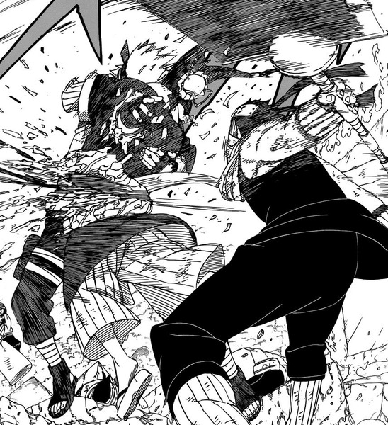 Zurück auf dem Kampfeld, sagt Kakashi, dass er sehr froh sei, dass Zabuza und Haku Narutos erste Gegner gewesen sind, da sie ihn positiv beeinflusst haben. Kakashi beginnt ein Raikiri zu formen und befiehlt mei, sie solle in Bereitschaft gehen und auf sein Zeichen achten. Kakashi sagt zu Zabuza, als er zum Schlag aufholte, dieser kurz gezögert habe, weil er nicht den Tot Hakus verborgen halte konnte. Kakashi erinnert sich an den Rest des Gespräches mit Naruto damals, Naruto sagt, dass er die Gegner, Zabuza und Haku gemocht habe und es nicht vielleicht merkwürdig sei. Kakashi erwidert dies und sagt, dass er diese ebenfalls gemocht hat. Kakashi gibt nun das Zeichen, dass Ensui mit seinem Kagemane-Jutsu Zabuza bewegungsunfähig machen soll. Dies gelingt auch. Maki versiegelt mithilfe ihres Menoshibari-Jutsus Zabuza und Haku. Kakashi nimmt sich das Schwert von Zabuza und sagt zu Sai, dass dieser dessen Versiegelungsfähigkeiten bräuchte. Kakashi sagt, dass Sai nicht mehr seine Gefühle unterdrücken solle, da dieser ein erstklassiger Ninja sei. Kakashi meint, dass er normalerweise ein sehr gelassener Mensch sei, aber jetzt stehe er kurz vor dem Ausrasten.