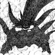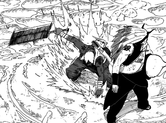 Darui kann seinen Augen nicht trauen. Vor im steht Kinkaku im Kyuubi-Modus! Er ist umhüllt mit dem Chakra des Neunschwänzigen. Es haben sich bei ihm sechs Schwänze gebildet, allerdings ohne Knochen, wie es bei Naruto der Fall wäre. Ein starker Chakra-Schwanz wird auch von den anderen Shinobi auf dem Schlachtfeld wahrgenommen. Kakuzu sagt, er hätte Kinkaku in diesem Zustand schon lange nicht mehr gesehen und dass dies bedeuten müsse, dass jemand seinen Bruder Ginkaku besiegt hat. Darui ist immer noch ausser sich und steht erschöpft Kinkaku im “Kyuubi-Modus” gegenüber.