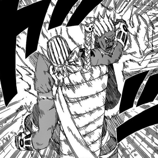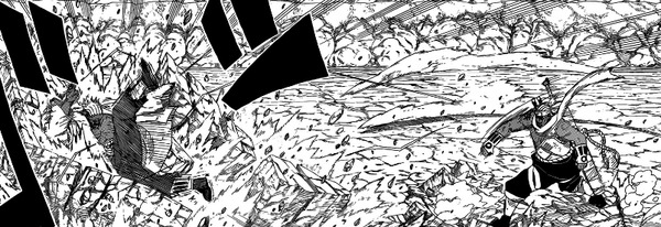 Bee meint, dass sein Bruder dieser unterschätze, seitdem er Raikage geworden sei. Daraufhin erinnert sich E an dem Tag, als sein Vater der ehemalige Raikage, gestorben ist. Er meinte damals zu Bee, dass er das Dorf nicht mehr verlassen sollte. Sie seien im Krieg, er müsse nun das Dorf und das Land beschützen, als neuer Raikage. Weiteres soll Bee anfangen seine Bijuu-Bombe in der Donner-Schlucht zu trainieren. In der Gegenwart zurück, meint der Raikage, dass die beiden Jinchurikis sehr wichtig sind. Es ist egal, wie stark sie sind, Akatsuki hat alle anderen 7 Jinchurikis bereits eingefangen. Deshalb könne er sie nicht weitergehen lassen, meint der Raikage weiter. Daraufhin setzen Bee und der Raikage wieder zum Lariat-Duel an. Diesmal schafft es Bee das Lariat vom Raikage zu übertrumpfen. Dessen Kraft kommt nicht nur daher, dass sie Jinchurikis sind. Die wahre Kraft kommt “von wo anders”. Jetzt sei er, der von oben auf seinen Bruder runter schaut, meint Bee weiter.