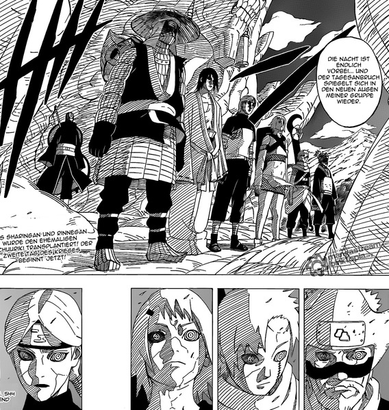 Die Sonne geht langsam wieder auf und der zweite Tag des Ninja Weltkrieges beginnt. Anscheinend wird Madara nun aktiv. Er transplantiert allen wiederbelebten ehemaligen Jinchuuriki ein Rin'negan als auch ein Sharingan in den Augen. Diese bezeichnet er als die neuen Pain der sechs Pfade…