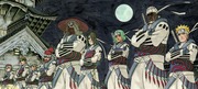 Sie müssen zuerst Mal die Fähigkeiten der einzelnen Jinchuuriki herausfinden, meint Kakashi und greift sie gemeinsam mit Guy an. Kakashi benutzt ein Raikiri und Guy öffnet das 6 Tor. Drei der Jinchuuriki gehen auf Naruto los doch dieser kontert mit zwei Rasengan. Kakashi meint, dass keiner der Jinchuuriki eins der Jutsus von Pain benutzen, doch dann bemerkt er etwas!