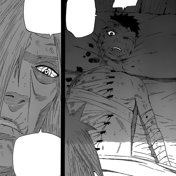 Währenddessen fragt Kakashi, was nun aus Obito geworden sei und warum er sich Uchiah Madara angeschlossen hätte. Obito erinnert sich zurück, wie er verletzt mit vielen Bandagen auf einem Bett erwacht und Madara über ihn gebeugt steht und ansieht. Madara ist zu diesem Zeitpunkt sehr alt.