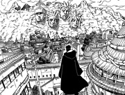 Obito und Zetsu stehen Nagato, Yahiko und Konan. Dieser stellt sich als Madara Uchiha vor, Yahiko meint daraufhin, dass er ein Krimineller und ein Idiot sein müsste, wenn er nur den Namen Madaras benutze. Obito erklärt, dass er und seine Organisation sich die Aufgabe gemacht hat eine neue friedliche Welt zu erschaffen. Dies könnte man allerdings nur mit Hilfe des Rinnegangs realisiere, welches Nagato jetzt trägt.