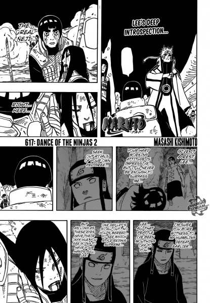 Das Kapitel fängt bei Lee an. Dieser hat einen kurzen Flashback über Neji und deren Rivalität gegeneinander, doch nun ist Neji tot und ihre Rivalität auch vorbei. Die nächste Aktion bestimmt Naruto. Er übergibt Lee ein bisschen Kyuubi Chakra und sie bereiten sich für ihren nächsten Angriff vor. Danach hat Kakashi einen Flashback und man hört die Erläuterung von Shikaku über das Chakra des Kyuubis und die Steigerung seines Kamuis. Später meldet sich auch Kyuubi zu Wort und dieser scheint recht glücklich, dass Naruto seine Eltern überboten hat und jetzt perfekt zu Kurama passt. Man sieht das auch sehr gut anhand der Graphik bei der gezeigt wird, dass Naruto als perfektes Gegenstück zu Kurama passt. Somit kann er das Chakra allen anderen Personen übermitteln und weiterleiten.