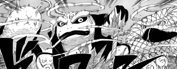 Dann könnte man den Juubi auch wirklich gefährden und sonst nicht. Ausserdem wäre es zu weit für Naruto darüber zu springen und er müsste jetzt aufpassen, weil die Medic-Ninjas nicht so weit vordringen können um ihn dann notfalls heilen zu müssen. Team 7 ist das aber egal und startet die nächste grosse Aktion! Alle 3 rufen ihrem Vertrauten Geist hervor und sind bereit die grossen Monster zu erledigen. Naruto, Sasuke und Sakura stehen jetzt über ihren Vertrauten Geister und ähneln den drei Sannin. Der Kampf kann weitergehen!