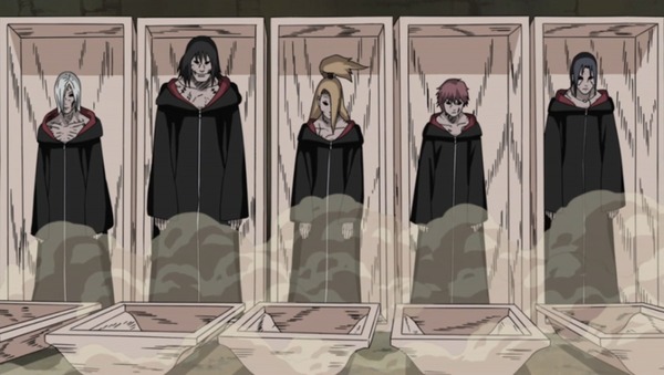 Zur selben Zeit findet das Team von Anko, bestehend aus Tokuma Hyuga, Muta Aburame und Ranka, die Leichen der Takigakure-Ninja, die Kabuto tötete. Parallel dazu begegnet Kabuto Madara. Dieser ist überrascht, dass Kabuto ihn ausfindig machen konnte. Madara greift Kabuto an, nachdem er sagt, das Kabuto Sasoris ehemaliger Spion war und somit ein Verräter Akatsukis ist. Doch Kabuto kann Madaras Angriff blocken und benutzt daraufhin das Edo Tensei und beschwört die verstorbenen Akatszuki-Mitglieder: Itachi, Sasori, Deidara, Kakuzu und Nagato, um Madara seine Stärke zu beweisen. Er meint, er wolle nicht kämpfen. Kabuto schlägt Madara ein Bündnis vor, im Zuge dessen er Madara während des Krieges unterstüzt, indem er die beschworenen Akatsuki für ihn kämpfen lässt. Als Gegenleistung verlangt er, dass er Sasuke nach dem Ende des Krieges für seine Experimente erhält. Als Madara andeutet, dass er ablehnen wolle, beschwört Kabuto eine weitere Person, vor der sich Tobi zu fürchten scheint und deshalb dem Bündnis zustimmt. Team Anko findet erneut eine Takigakure-Leiche. Als Tokuma mit dem Byakugan den Wald absucht, sieht er Madara und Kabuto, während sie in Madaras Versteck gehen. Zuletzt vermutet Anko, dass Kabuto mit den Leichen eine Spur hinterlassen hat, sodass das Team weiss, wo Madaras Versteck sei.