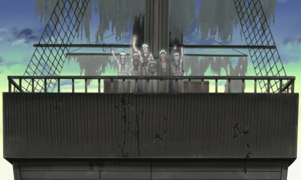 Das Meer ist mittlerweile unruhig geworden. Yamato nutzt die Chance, um Naruto eine Geistergeschichte zu erzählen: Er habe gehört, dass „es“ an Tagen wie diese erscheinen soll. Es erscheint, geleitet von Krähen. Krähen, die die Seelen von toten Männern führen. Eine riesige Laterne eines Ordensbruders, die den Mast erleuchtet bestätigt, dass „es“ anwesend ist. Der dichte Nebel enthält die Seelen toter Menschen. Das Schiff, es reist zum Land der Toten. Das ist… das Geisterschiff von Kitakyushu!