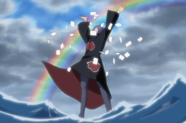 Rückblende: Zu sehen sind Konan, Nagato, Yahiko und Jiraiya, die alle einen ziemlich albernen Ganzkörperfroschanzug tragen. Am Anfang ihrer gemeinsamen Zeit, haben sie sich Verhaltensregeln und geheime Botschaften ausgedacht, später trainierten sie richtig, bis Jiraiya sie schliesslich verliess. Seine drei Schüler blieben in ihrem Versteck zurück und verliessen ihr gemeinsames Zuhause erst, als man dort nach ihnen suchte, um sie zu töten.